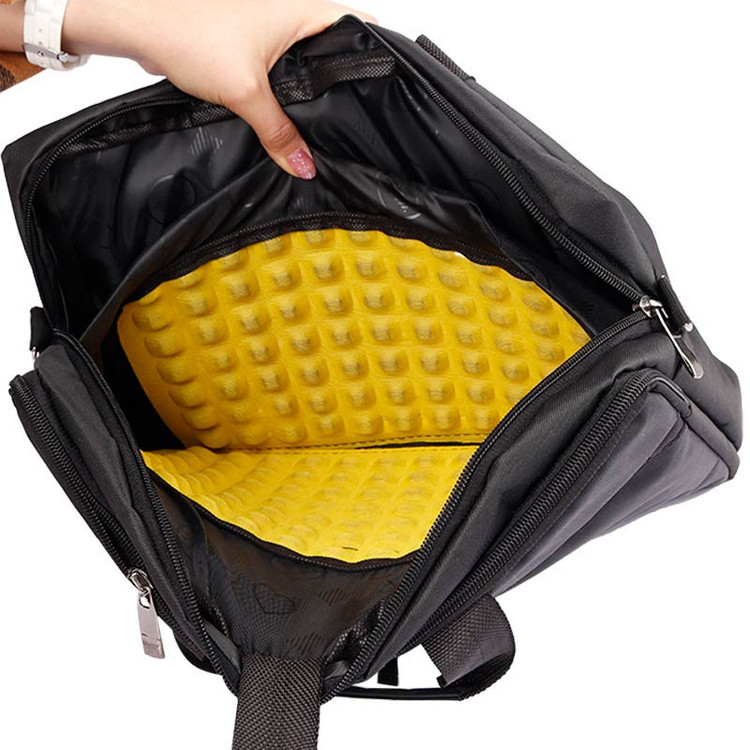 دارای جیب های زیپ دار متنوع در قسمت جلو، پشت و ... جهت قرارگیری کتاب، دفتر و سایر لوازم